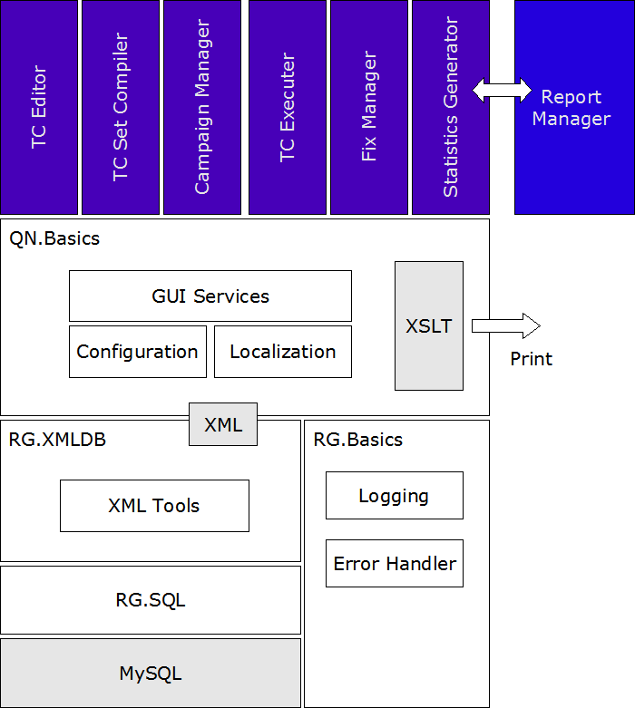 Die Implementation des Report Manager basiert auf Jakarta-Tomcat als Webserver und MySQL zur Datenhaltung, ist aber nicht auf diese beschränkt. Der JSP/Servlet Teil folgt ausschliesslich dem J2EE Standard, die Datenhaltung ist als JDBC-Implementation unabhängig von Datenbankherstellern.